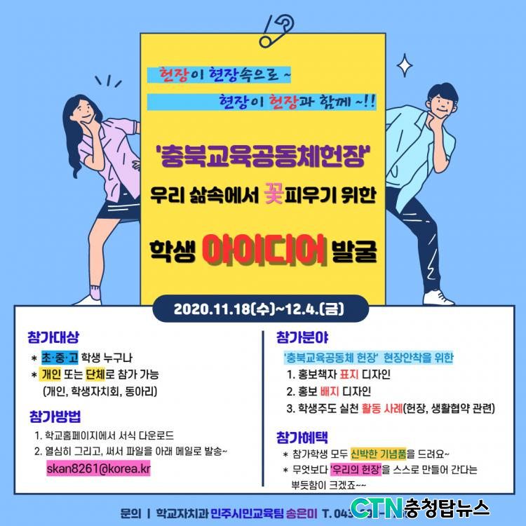 [CTN ÃæÃ»±³À°½Å¹® = ¹Úö¿ì ±âÀÚ] ÃæÃ»ºÏµµ±³À°Ã»(±³À°°¨ ±èº´¿ì)Àº ÃæºÏ±³À°°øµ¿Ã¼ ÇåÀå ÇöÀå ¾ÈÂø¹æ¾ÈÀ» À§ÇÏ¿© ÃÊ‧Áß‧°í Çлý°ú ±³¿øÀ» ´ë»óÀ¸·Î ¿À´Â 12¿ù 4ÀÏ(±Ý)±îÁö ±³À°ÇöÀåÀÇ ¾ÆÀ̵ð¾î¸¦ ¹ß±¼ÇÑ´Ù°í ¹àÇû´Ù.