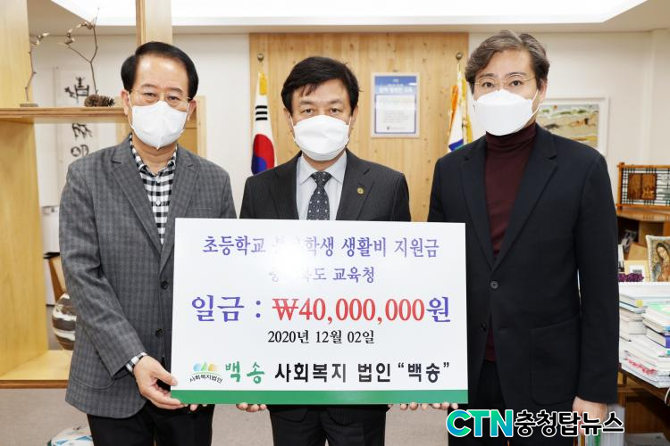 [CTN ÃæÃ»±³À°½Å¹® = ¹Úö¿ì ±âÀÚ] ÃæÃ»ºÏµµ±³À°Ã»(±³À°°¨ ±èº´¿ì)´Â 12¿ù 2ÀÏ(¼ö) ¿ÀÀü 10½Ã »çȸº¹Áö¹ýÀÎ '¹é¼Û' ¿¡¼ µµ±³À°Ã»À» ¹æ¹®ÇÏ¿© ÃʵîÇлý »ýȰÁö¿ø±Ý 4õ ¸¸ ¿øÀ» Àü´ÞÇß´Ù°í ¹àÇû´Ù.