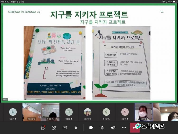 ±× Áß¿¡¼µµ ¿µ¾î ȯ°æ µ¿¾Æ¸® SESU(Save the Earth Save Us:Áö±¸¸¦ ÁöŰ°í ¿ì¸®¸¦ ÁöŰÀÚ)´Â ¿Áõ¿©Áß Àüü ÇбÞÀ» ´ë»óÀ¸·Î 'Áö±¸¸¦ ÁöŰÀÚ ÇÁ·ÎÁ§Æ®'·Î À½½Ä¹° ³²±âÁö ¾Ê±â, ÇÃ¶ó½ºÆ½ Àß ¹ö¸®±â µîÀÇ Ä·ÆäÀÎÀ» Àü°³ÇÏ¸é¼ ½ºÆ¼Ä¿¸¦ ¹èºÎÇÏ°í ½ºÆ¼Ä¿°¡ °¡Àå ¸¹Àº Çб޿¡°Ô Á÷Á¢ Á¦ÀÛÇÑ È¯°æ ¹îÁö¸¦ Á¦°øÇÏ´Â µî ȯ°æÀ» »ý°¢ÇÏ´Â Çб³ ¹®È ¸¸µé±â¿¡ ¾ÕÀå¼°í ÀÖ´Ù.