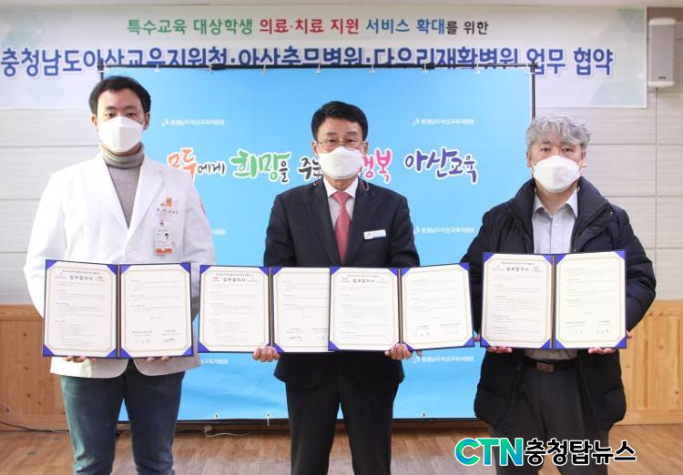 [CTN ÃæÃ»±³À°½Å¹® = Á¶¼ºÂù ±âÀÚ] ¾Æ»ê±³À°Áö¿øÃ»(±³À°Àå À̹®Èñ)Àº 12¿ù 10ÀÏ Æ¯¼ö±³À° ´ë»óÇлýÀÇ ¸ÂÃãÇü ÀÇ·á Áö¿ø ü°è ±¸Ãà ¹× Ä¡·áÁö¿ø ¼ºñ½º È®´ë¸¦ À§ÇÏ¿© ¾Æ»êÃæ¹«º´¿ø(ÇàÁ¤¿øÀå ±ÇÁØ´ö), ´Ù¿ì¸®ÀçȰº´¿ø(º´¿øÀå Á¶´ë°æ)°ú ¾÷¹«Çù¾àÀ» ü°áÇß´Ù.