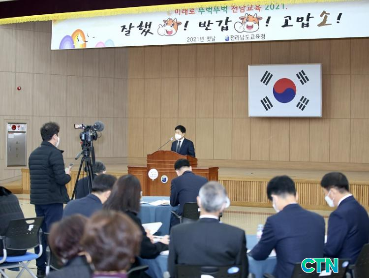 [CTN ÃæÃ»±³À°½Å¹® = Çϼº¸Å ±âÀÚ] Àü¶ó³²µµ±³À°Ã»(±³À°°¨ Àå¼®¿õ)ÀÌ 4ÀÏ(¿ù) ¿ÀÀü û»ç 2Ãþ ´ëȸÀǽǿ¡¼ 2021³â ½Ã¹«½ÄÀ» °®°í 'Èñ¸ÁÀÇ 2021³â' »õ Ãâ¹ßÀ» ´ÙÁüÇß´Ù.
