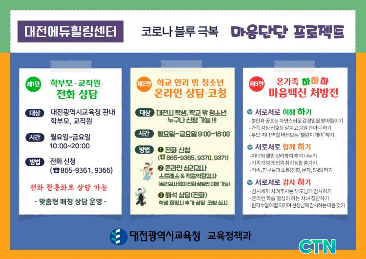 [CTN ÃæÃ»±³À°½Å¹® = Á¤¹ÎÁØ ±âÀÚ] ´ëÀü±¤¿ª½Ã±³À°Ã»(±³À°°¨ ¼³µ¿È£) ¿¡µàÈú¸µ¼¾ÅÍ´Â Äڷγª 19°¡ Àå±âÈµÇ¸é¼ ¿ì¿ï°¨, ¹«±â·Â°¨, °¡Á· °£ÀÇ °¥µî µî Àϸí Äڷγª ºí·ç·Î ½É¸®Àû ¾î·Á¿òÀ» °Þ°í ÀÖ´Â ±³À° °¡Á·À» À§ÇÏ¿© 2020³âºÎÅÍ ½Ç½ÃÇÑ ¡®Äڷγª ºí·ç ±Øº¹ ¸¶À½´Ü´Ü ÇÁ·ÎÁ§Æ® 1~3ꡝÀ» 2021³âµµ¿¡µµ Áö¼ÓÀûÀ¸·Î ½Ç½ÃÇÑ´Ù°í ¹àÇû´Ù.