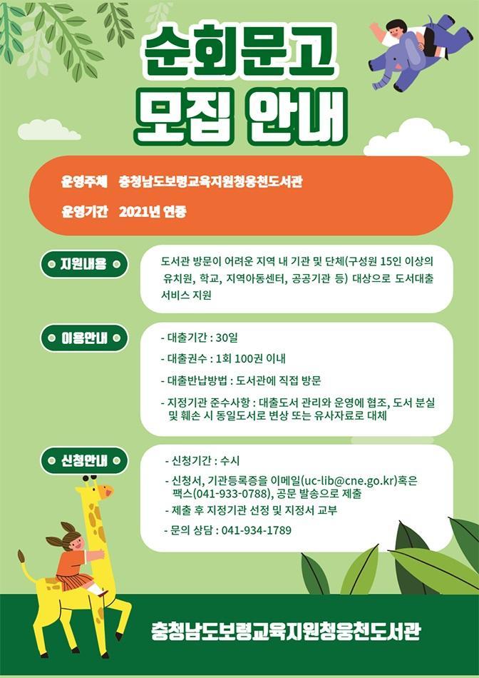 ¼øÈ¸¹®°í´Â ±â°ü ¹× ´Üü(±¸¼º¿ø 15ÀÎ ÀÌ»óÀÇ À¯Ä¡¿ø, Çб³, Áö¿ª¾Æµ¿¼¾ÅÍ, °ø°ø±â°ü µî) ´ë»óÀ¸·Î µµ¼¸¦ Àå±â°£ ´ë¿©ÇØ ÁÖ´Â ¼ºñ½º´Ù. ¼øÈ¸¹®°í ±â°üÀ¸·Î ÁöÁ¤µÇ¸é Èñ¸Áµµ¼ ¹× »ç¼ Ãßõµµ¼¸¦ ¼±Á¤ÇÏ¿© ÀÏÁ¤ ±â°£ ´ë¿©ÇØÁÖ°í, ÀÏÁ¤ ±â°£ÀÌ Áö³ª¸é ´Ù¸¥ µµ¼·Î ´ë¿©ÇÏ´Â ¹æ½ÄÀ¸·Î ¿î¿µµÈ´Ù. ¼øÈ¸¹®°í´Â ¼ö½Ã·Î ¸ðÁýÀ» Çϸç À̸ÞÀÏ(uc-lib@cne.go.kr), ÆÑ½º(041-933-0788), °ø¹®À¸·Î ½ÅûÀÌ °¡´ÉÇÏ´Ù.