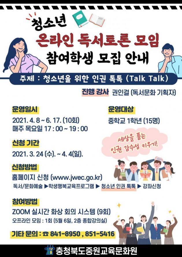 [CTN ±³À°½Å¹® = ¹Úö¿ì ±âÀÚ] ÃæÃ»ºÏµµÁß¿ø±³À°¹®È¿ø(¿øÀå ¾öº´¿ë)Àº û¼Ò³âµéÀÇ °ÇÀüÇÑ ¿Â¶óÀÎ µ¶¼ ¹®È È®»êÀ» À§ÇØ ÁßÇб³ 1ÇгâÀ» ´ë»óÀ¸·Î ¿Â¶óÀÎ µ¶¼Åä·Ð ¸ðÀÓ 'û¼Ò³âÀ» À§ÇÑ À뱂 ÅåÅå(Talk Talk)'À» ¿î¿µÇÑ´Ù°í 25ÀÏ ¹àÇû´Ù.