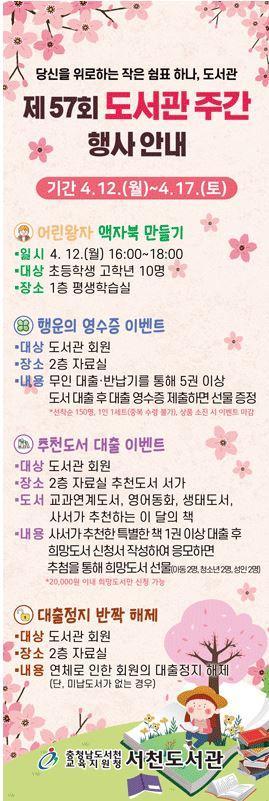 À̹ø µµ¼°ü ÁÖ°£Àº '´ç½ÅÀ» À§·ÎÇÏ´Â ÀÛÀº ½°Ç¥ Çϳª, µµ¼°ü'À̶ó´Â °ø½ÄÇ¥¾î ¾Æ·¡ ¡ã ¾î¸°¿ÕÀÚ ¾×ÀÚºÏ ¸¸µé±â ¡ã Çà¿îÀÇ ¿µ¼öÁõ ¡ã Ãßõµµ¼ ´ëÃâ Çà»ç ¡ã ´ëÃâ Á¤Áö ¹Ý¦ ÇØÁ¦ ¡ã ½Å±Ô°¡ÀÔ È¸¿ø Çà»ç ¡ã 4¿ù ¿Â¶óÀÎ µ¶¼ Çà»ç ¡ã 4¿ù »ç¼°¡ ÃßõÇÏ´Â ÀÌ´ÞÀÇ Ã¥ µî ÃÑ 7°³ Çà»ç¸¦ ¿î¿µÇÑ´Ù.