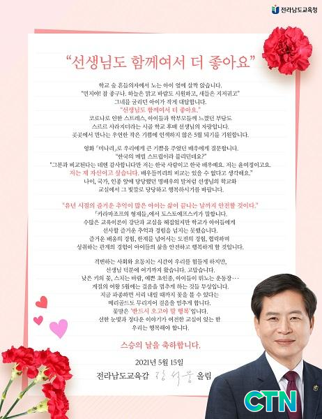 Àå¼®¿õ ±³À°°¨Àº À̳¯ Àü¶ó³²µµ±³À°Ã»ÀÌ Á¦ÀÛÇØ ȨÆäÀÌÁö¿Í À¯Æ®ºê ä³Î(Àü³²±³À°TV) µî¿¡ ¿Ã¸° ½º½ÂÀÇ ³¯ ÃàÇÏ¿µ»ó¿¡ Ãâ¿¬ÇØ "Á¦40ȸ ½º½ÂÀÇ ³¯À» ¸Â¾Æ Àü³²ÀÇ ¸ðµç ¼±»ý´Ôµé²² ±íÀº Á¸°æ°ú °¨»çÀÇ ¸¶À½À» ÀüÇÑ´Ù"°í ¸»Çß´Ù.