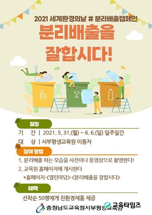 [CTN ±³À°½Å¹® = °¡±ÝÇö ±âÀÚ] ÃæÃ»³²µµ±³À°Ã»¼ºÎÆò»ý±³À°¿ø(¿øÀå ±èÁ¾½Å)Àº 6¿ù 5ÀÏ ¼¼°èȯ°æÀdz¯À» ¸Â¾Æ 5¿ù 31ÀϺÎÅÍ 6¿ù 6ÀϱîÁö 'ºÐ¸®¹èÃâÀ» ÀßÇսôÙ!' Çà»ç¸¦ ÁøÇàÇÑ´Ù.