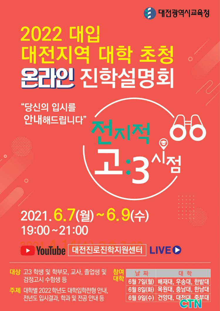 [CTN ±³À°½Å¹® = Á¤¹ÎÁØ ±âÀÚ] ´ëÀü±¤¿ª½Ã±³À°Ã»(±³À°°¨ ¼³µ¿È£)Àº Äڷγª19 »óȲ ¼Ó¿¡¼ ÁøÇÐÁ¤º¸ °ø¹éÀÇ ÃÖ¼ÒÈ¿Í ´ëÀÔȯ°æ º¯È¿¡ µû¸¥ Áö¿ª´ëÇÐÀÇ Áö¿ªÀÎÀç ¾ç¼ºÀ» À§ÇØ °í3 Çлý ¹× Çкθð, ´ãÀÓ±³»ç¸¦ ´ë»óÀ¸·Î ¡®2022 ´ëÀÔ ´ëºñ ´ëÀüÁö¿ª ´ëÇÐ ÃÊû ´ëÇÐÀÔÇÐÀüÇü ¼³¸íȸ¡¯¸¦ ¿Â¶óÀÎÀ¸·Î °³ÃÖÇÑ´Ù.