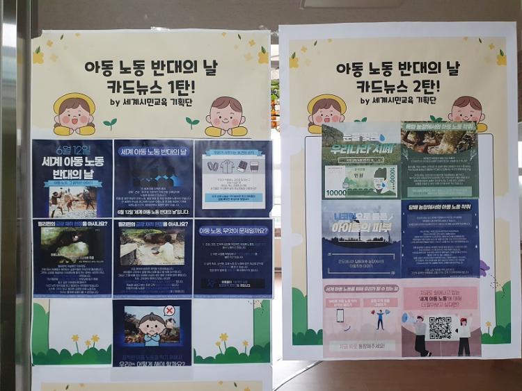 Ȱµ¿ ±â°£ µ¿¾È ÇлýµéÀº 'ȯ°æÀÇ ³¯'°ú '¾Æµ¿ ³ëµ¿ ¹Ý´ëÀÇ ³¯'À» ¸Â¾Æ ÇлýµéÀ» ´ë»óÀ¸·Î ¿Ã¹Ù¸¥ ÀçȰ¿ë ¹æ¹ý, ¸ÂÃãÇü ±×¸° ¸ÞÀÌÄ¿ ¹× ȯ°æ¹®Á¦¿¡ ´ëÇÑ ±³À°À» ÇÏ°í ¾È ¾²´Â ¹°°ÇÀ» Àç»ç¿ëÇϱâ À§ÇÑ 'ÀÚ¿ø ÀçȰ¿ë ¹Ù±¸´Ï', 'Ã¥ ±âºÎ'Ȱµ¿, ºÒÇÊ¿äÇÑ ¿¡³ÊÁö ³¶ºñ¸¦ ¸·´Â ¾È ¾²´Â À̸ÞÀÏ Áö¿ì±â 縰Áö µî°ú ¾Æµ¿³ëµ¿ Çö½Ç¿¡ ´ëÇÑ Ä«µå´º½º ¹× Æûº¸µå Àü½Ã, ºÒ¹ý ¾Æµ¿ ³ëµ¿ ¹Ý´ë SNS Ä·ÆäÀÎ, °øÁ¤¹«¿ª Áöµµ∙Àå¹Ù±¸´Ï Á¦ÀÛ µîÀÇ È°µ¿À» ÁøÇàÇÑ´Ù.