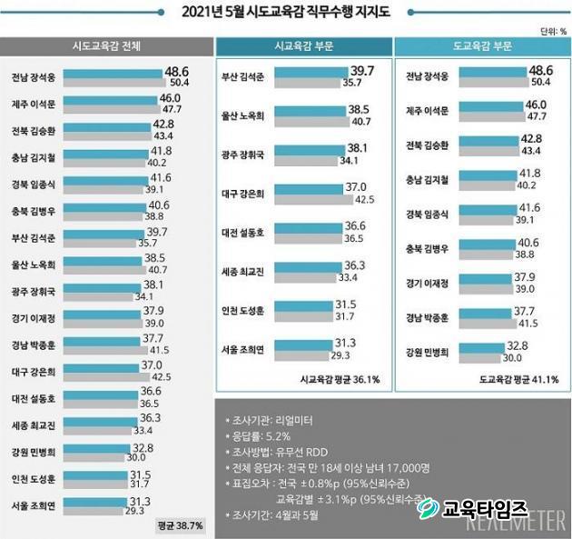 Àü±¹ ±³À°°¨ 17¸íÀÇ 2021³â Áö³ 5¿ù Æò±Õ ÁöÁöÀ²Àº 38.7%ÀÌ´Ù.