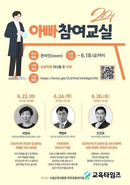 [CTN ±³À°½Å¹® = ±èÁö¿ì ±âÀÚ] ¼ö¿ø±³À°Áö¿øÃ»(±³À°Àå ÀÌÇü¿ì)Àº 6¿ù 22ÀϺÎÅÍ 26ÀϱîÁö 3ȸ±â¿¡ °ÉÃÄ ÃʵîÇлý Àڳฦ µÐ ¾Æ¹öÁö¸¦ ´ë»óÀ¸·Î '2021¾ÆºüÂü¿©±³½Ç'À» ½Ç½ÃÇÑ´Ù.