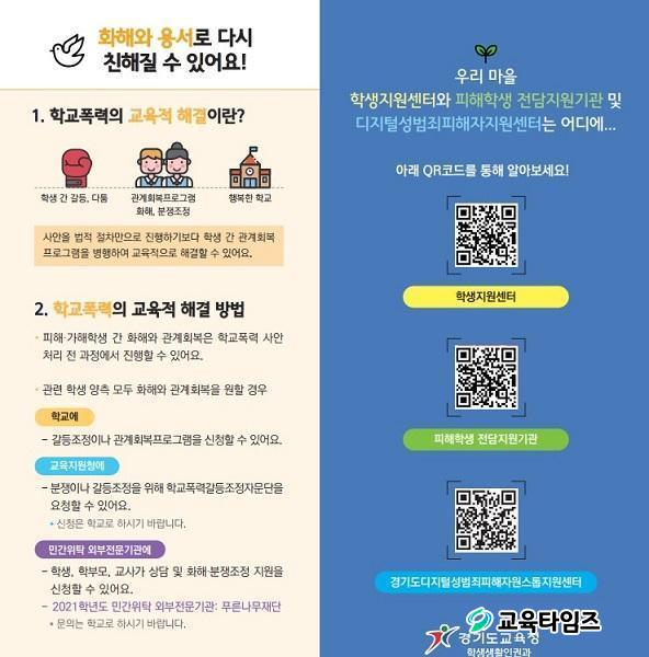 ¾È³»ÀÚ·á¿¡´Â ÇлýÁö¿ø¼¾ÅÍ ¿ªÇÒ°ú Çб³Æø·Â°ú °ü·ÃµÈ ¿©·¯ ÇØ°á °úÁ¤°ú ¹æ¾È µîÀ» ´ã°í ÀÖÀ¸¸ç, ±³À°Áö¿øÃ» ÇлýÁö¿ø¼¾ÅÍ, ÇÇÇØÇлý Àü´ãÁö¿ø±â°ü µî °ü·Ã Á¤º¸¸¦ QRÄÚµå·Î Á¦°øÇÑ´Ù.