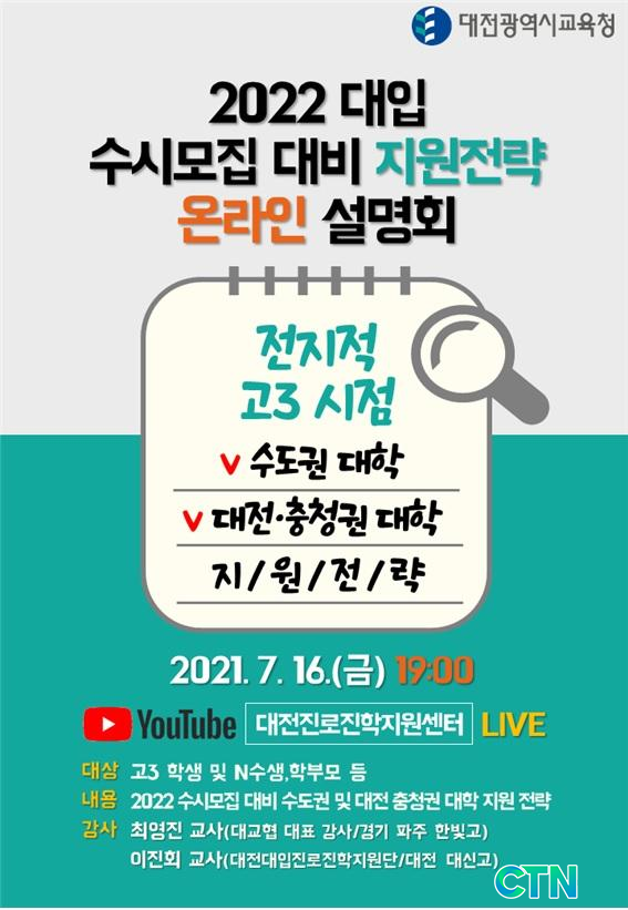 [CTN ±³À°½Å¹® = Á¤¹ÎÁØ ±âÀÚ] ´ëÀü±¤¿ª½Ã±³À°Ã»(±³À°°¨ ¼³µ¿È£)Àº ¿À´Â 16ÀÏ ¿ÀÈÄ 7½Ã °í3 Çлý°ú Çкθ𸦠´ë»óÀ¸·Î ´ëÀüÁø·ÎÁøÇÐÁö¿ø¼¾ÅÍ À¯Æ©ºê ä³ÎÀ» ÅëÇØ ¡®2022 ´ëÀÔ ¼ö½Ã¸ðÁý ¿Â¶óÀÎ ÁøÇм³¸íȸ¡¯¸¦ ½Ç½Ã°£À¸·Î ½Ç½ÃÇÑ´Ù.