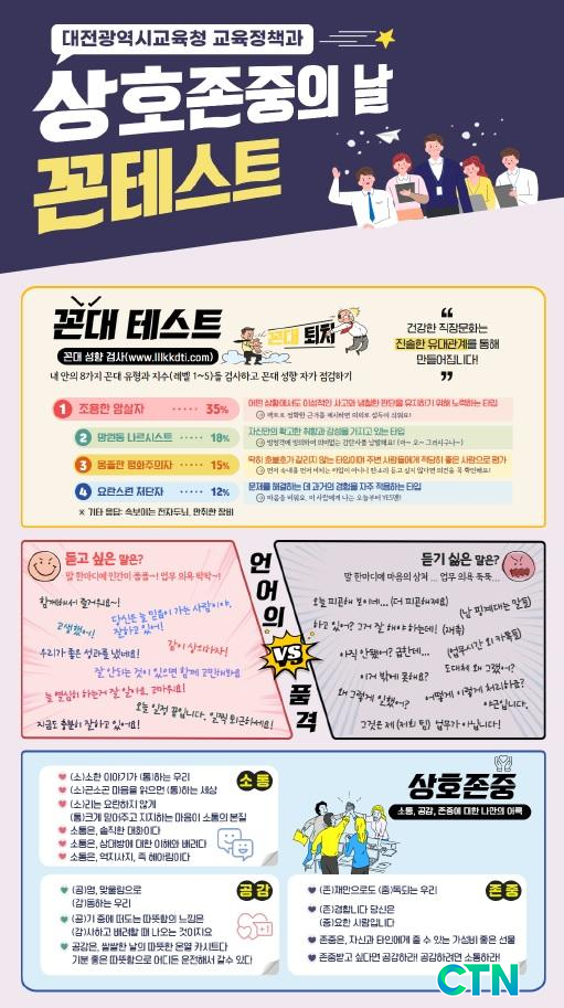 [CTN ±³À°½Å¹® = Á¤¹ÎÁØ ±âÀÚ] ´ëÀü±¤¿ª½Ã±³À°Ã»(±³À°°¨ ¼³µ¿È£) ±³À°Á¤Ã¥°ú´Â û·Å ¹®È¸¦ È®»êÇϰí Á÷Àå ³» °©Áú ±ÙÀý ¹× ¼ÒÅë°ú °ø°¨ÀÇ Á¶Á÷ ¹®È Á¶¼ºÀ» À§ÇØ ¸Å¿ù 11ÀÏÀ» »óÈ£ Á¸ÁßÀÇ ³¯·Î ÁöÁ¤ÇØ ¿î¿µÇϰí ÀÖ´Ù°í ¹àÇû´Ù.