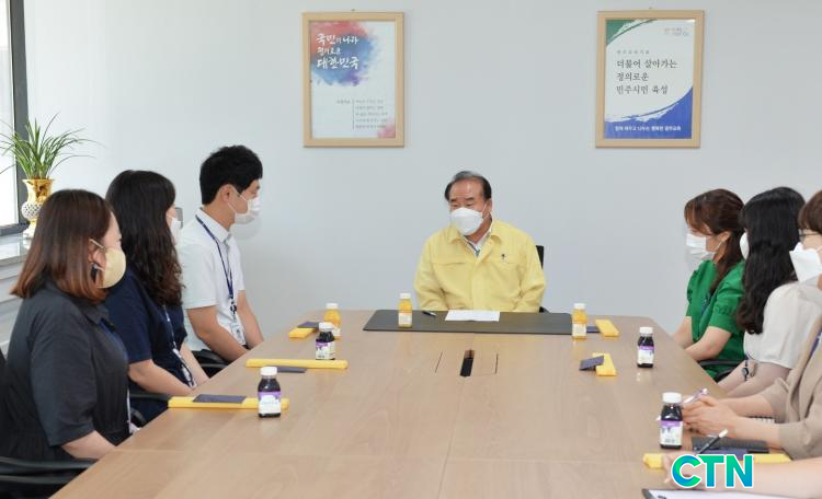 [CTN ±³À°½Å¹® = ÃÖ¿µÁØ ±âÀÚ] ÀåÈÖ±¹ ±³À°°¨ÀÌ 15ÀÏ ±³À°°¨½Ç¿¡¼ Áö³ 7¿ù1ÀÏÀÚ·Î º»Ã»¿¡ ÀüÀÔÇÑ 8±Þ ÇàÁ¤Á÷ Á÷¿ø 5¸í°ú °£´ãȸ ÀÚ¸®¸¦ °¡Á³´Ù.