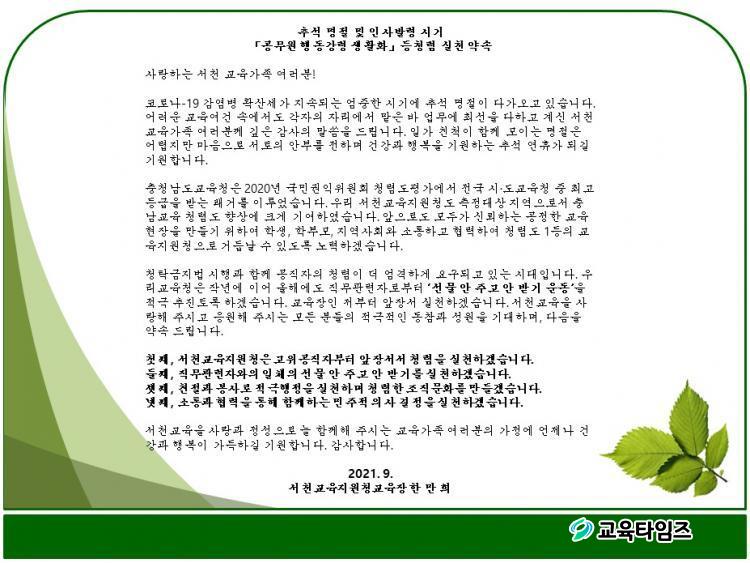 [CTN ±³À°½Å¹® = ÀÓÁ¾º¹ ±âÀÚ] ¼Ãµ±³À°Áö¿øÃ»(±³À°Àå ÇѸ¸Èñ)ÀÌ Ãß¼® ¸íÀýÀ» ¸Â¾Æ û·Å¹®È Á¤Âø ³ë·ÂÀ» ´çºÎÇϴ û·Å ¼Çѹ®(û·Å½Çõ ¾à¼Ó)À» ±³Á÷¿øµé¿¡°Ô ÀüÇß´Ù.