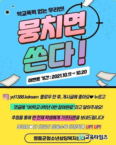 [CTN ±³À°½Å¹® = À̱ⱹ ±âÀÚ] ¿µµ¿±ºÃ»¼Ò³â»ó´ãº¹Áö¼¾ÅÍ´Â 21³â 10¿ù 11ÀÏ ~ 10¿ù 20ÀÏ SNS¸¦ Ȱ¿ëÇÑ ¿Â¶óÀÎ Çб³Æø·Â¿¹¹æ Ä·ÆäÀÎ '¹¶Ä¡¸é ½ð´Ù!' À̺¥Æ®¸¦ ÁøÇàÇÑ´Ù.